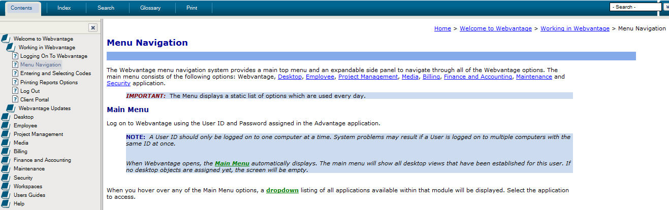 Links are used throughout help to make the material easier to understand and use for both beginners and expert Webvantage users. Links help keep the topic files uncluttered by providing a reference to additional information.